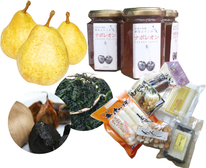 きりたんぽ、バターもち、いぶりがっこ、稲庭うどん、フルーツジャム、洋梨などズラリと並ぶ東北の食をおみやげにどうぞ。