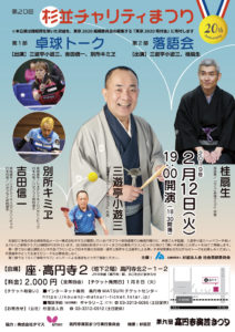 三遊亭小遊三(落語家/『らくご卓球クラブ』所属) 吉田信一(卓球選手/リオデジャネイロパラリンピック日本代表) 別所キミエ(卓球選手/リオデジャネイロパラリンピック日本代表) [第二部 出演] 三遊亭小遊三<落語> 桂扇生<落語> 杉並区に本社のある卓球用品メーカー株式会社タマスが運営しているバタフライ卓球道場では毎週月曜日に、林家こん平監督、三遊亭小遊三ヘッドコーチ率いる『らくご卓球クラブ』の練習が行われています。20回目の杉並チャリティまつりは東京パラリンピックに向けて「車いす卓球」にスポットを当てて開催します。 第一部では小遊三師匠とリオ大会パラリンピック日本代表の吉田信一選手と別所キミヱ選手による車いす卓球実演も交えながらのトークをお楽しみください。代表選手のとっておきエピソードもお聴き逃しなく。 第二部では『らくご卓球クラブ』メンバーによる落語をどうぞご堪能ください。 主催:公益社団法人杉並法人会社会貢献委員会 協力:株式会社タマス、高円寺演芸まつり実行委員会 後援:杉並区